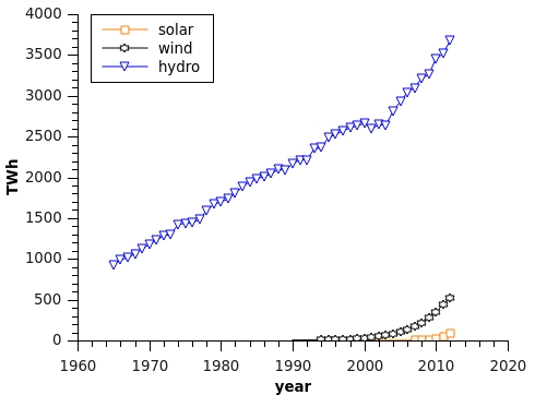 Wind, hyrdo and solar output (data from BP).