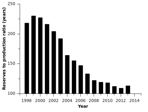 Coal the grubby founding energy father of the industrial revolution makes up 30% of global energy use according to BP. With the highest CO2 output of any fuel its use is very controversial. In our book we had a look at the coal supply going forward and noted the data from BP showed reserves had plunged in recent years (there is also a great uncertainty over this data). It also the case that reserves to production ratio – snapshot look at how much we have left by how much are using overstates how much is left. This is because production of minerals in the ground doesn’t go at full tilt until they run out, they tend to decline in a bellcurve shaped manner. Surprisingly the coal reserve data has shown a small increase in the last year (graph below).