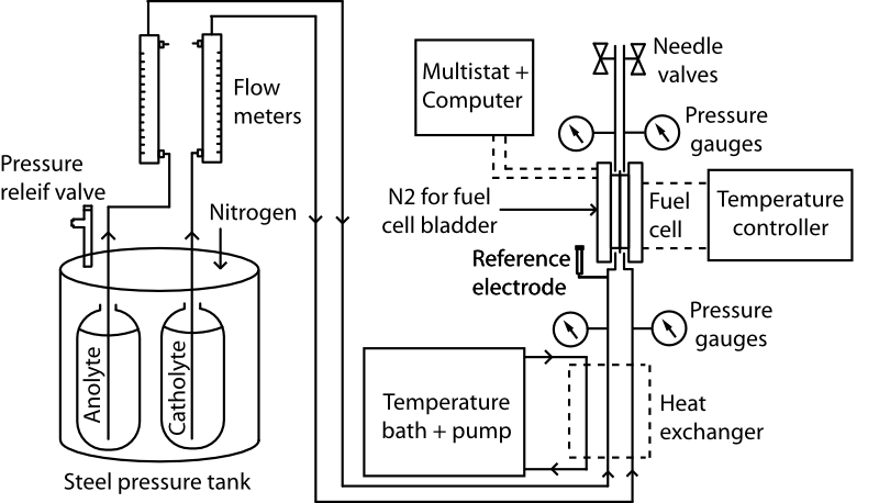 In the fuel cell all the above are reversed. At the anode hydrogen is split by the catalyst to protons and electrons. The electrons flow through the conductor joining the two and some are used by us to do “useful work”. At the cathode oxygen, electrons from the circuit and protons which have migrated though the semi-permeable membrane combine to make water. The idea is that the semi-permeable membrane allows the protons to migrate to the cathode compartment where it combines with the hydrogen and oxygen in the reverse reaction but does not allow the oxygen to enter the anode compartment.