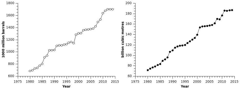 We have covered on this site before the possible peaking of gas reserves, but not oil and gas reserves together.  In 2014 the natural gas reserves increased very slightly by just 0.3%, this is just behind consumption, which increased by 0.4%.  This time the oil reserves have also shown a fall (the first for many years).  Its not huge one and all but invisible on the graph below (left hand graph).