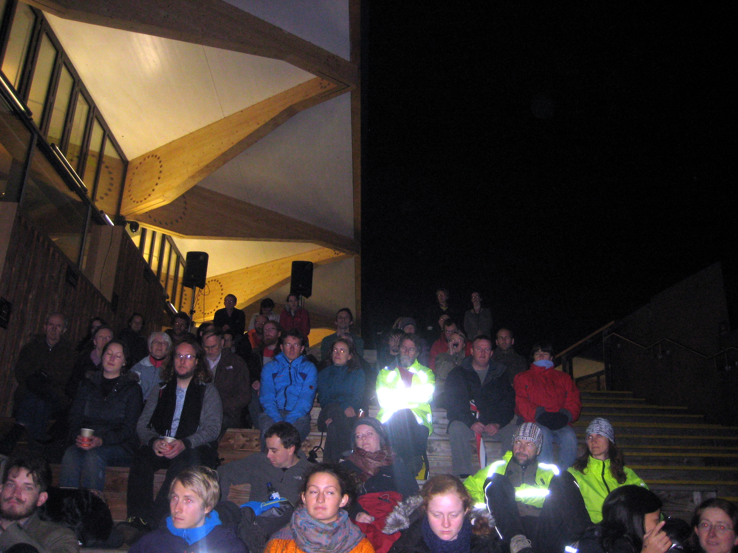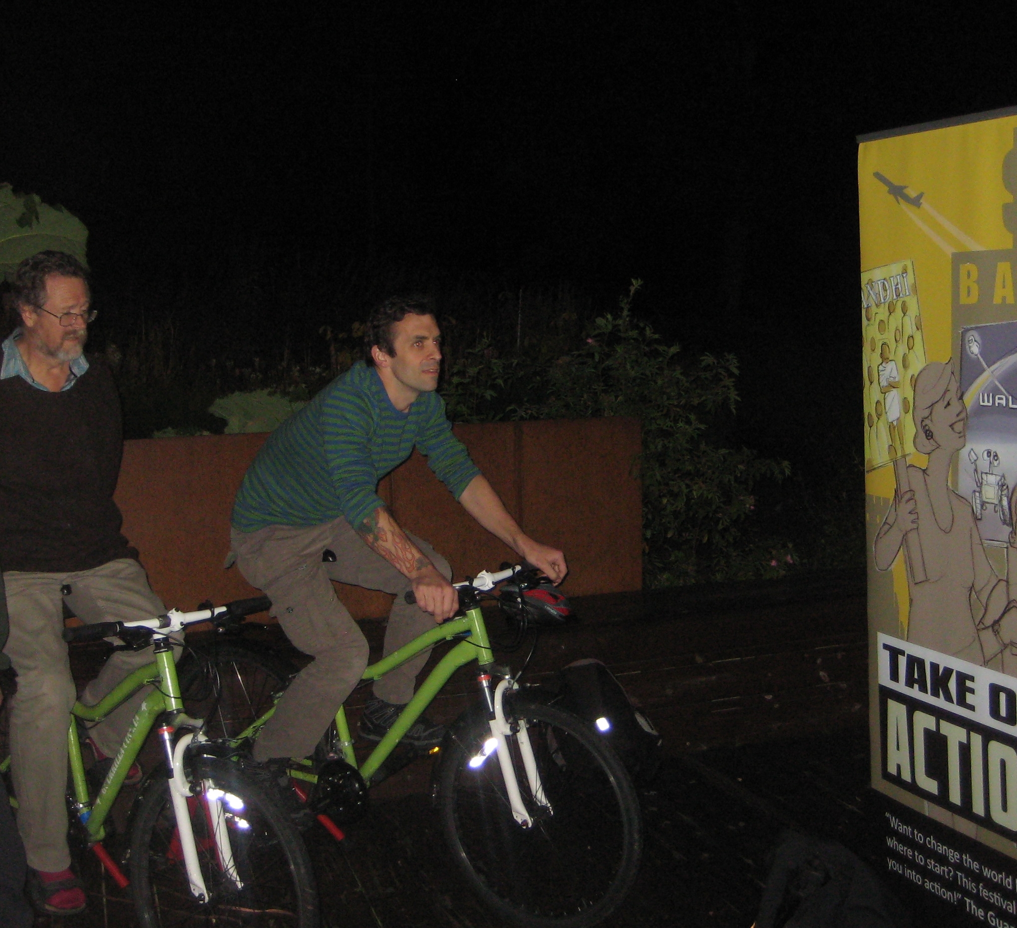I had a go at pedalling for about 15 minutes at the beginning, but there was a small but constant queue of eager volunteers wanting a go. Lucky I’d bought some warm clothes, for if you have heard of smellavision, this was freezeavision. Whilst the film showed ice melting we sat there freezing. Unfortunately the technology let us down. Heavy rain at the previous nights showing had damaged the equipment on the visual side and something went wrong with the sound side connection. It meant that in practical terms we powered about a quarter of the evenings sound and three quarters of its vision.