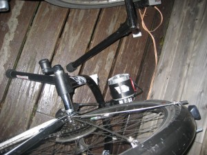 Have you ever tried powering a light-bulb using a cycle powered generator? Last Wednesday I went to screening of the film “Chasing Ice” organised by take one action in which we were to power the entire presentation by cycling. I’ve had a go at cycled bulb lighting before and its hard work. Getting an incandescent bulb to light up anything like fully is a challenge even Wiggo wouldn’t relish. Compact fluorescent bulbs are easier but still take great effort. When I last tried it LED’s weren’t on offer, but these must be fairly easy since thay use 20% or less of the electricity of an incandescent bulb. So when I turned up for the outdoor screening at Edinburgh’s Botanic gardens I was expecting a small army of pedal power and spend the entire time pedalling. In actual fact the entire screening could be powered by 7 cyclists, 5 for the visuals and 2 for the sound (see pictures below). These powered a smallish screen back projected by an overheard projector and a reasonable sound system all linked to a laptop with the film on.