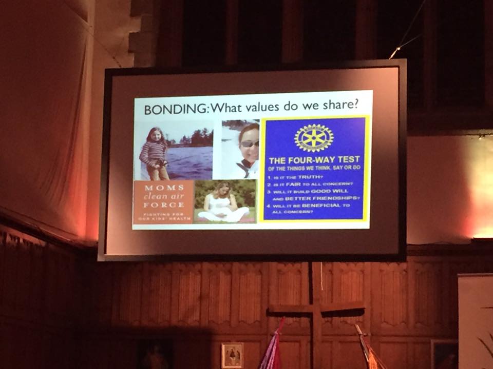 She believed that most peoples objections are not really political or religious and if they claim to be than we are fully equipped to take them on since we have so much in common in terms of values.  She used a number of examples of this to communicate climate change.  These included fishing, skiing and parenthood.  But the best example was over speaking to a local rotary club.  They had a set of values shown below in the image.  She saw these believed that climate change fitted with everyone and rewrote her talk accordingly (quickly).  Afterwards one person asked what he could do since what she had said fitted with the clubs values.  She also gave examples of how to interact with evangelicals in the same way.