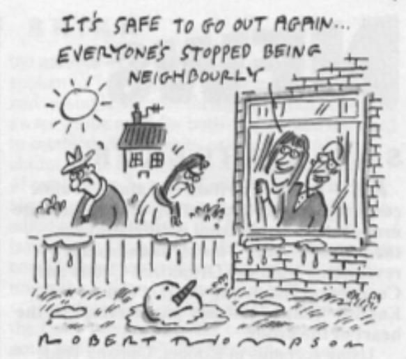 cartoon on snowDoes snow make for a kinder country?  It was noticeable how life changed when a fair amount of snow created complete disruption.  (We can argue about whether we need to spend a lot of money to make our infrastructure snow proof – this might be necessary with climate change.)  But for 48 hours the whole of the UK ground to a complete standstill.  The sense of change and community and a kinder country was very noticeable.  Churches threw open their doors to the homeless.  Businesses and people donated food and clothes (a person in my homegroup saw this in action as a volunteer).  Hotels through open their doors to stranded travellers and again supermarkets donated food.  Neighbours rallied around one another.