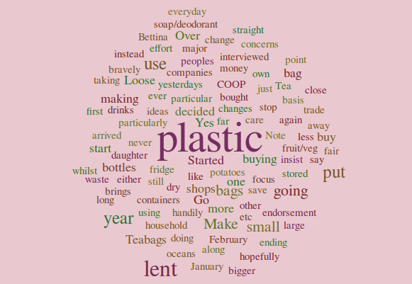 lent word cloud 2018Its not that its plastic lent or lent is plastic!  Lent has arrived again this year.  This I’m going to major on plastic.  Over the last year plastic waste has moved up most peoples agendas with particular concerns over plastic ending up in the oceans.  For lent this year I’ve decided to reduce my plastic use (as has my daughter who far more bravely than me is going to post what she does use on the internet).