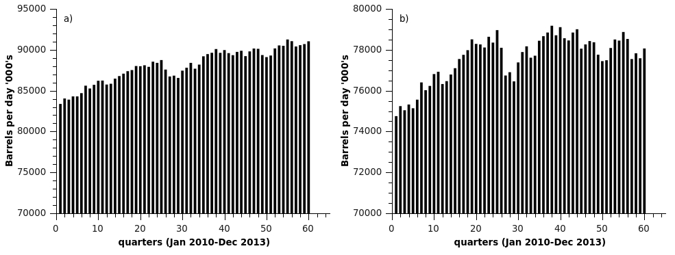 Has global oil production peaked?  Conventional oil – almost certainly.  All the easy stuff has gone.  There are number of alternative scenarios based around unconventional oil.  The first is that oil production increases due to US shale oil for a number of years and then as US production declines we reach peak oil, in probably less than 10 years.  The second is that other countries join in with shale oil and peak oil is set back again. All this time conventional fields are in decline and unconventional oil has to keep pace with both that and increasing demand.  Either way the oil price looks like staying high, you might notice that for all this increase over the last 35 quarters or so there has been no significant drop in the oil price.